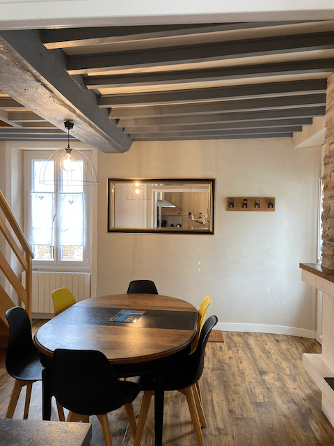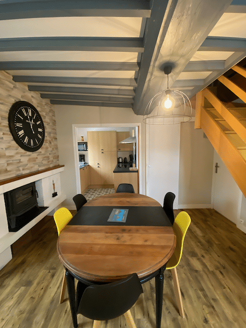 - Un coin repas à la fois moderne et rustique bénéficiant d’un poêle à bois pour des instants conviviaux.